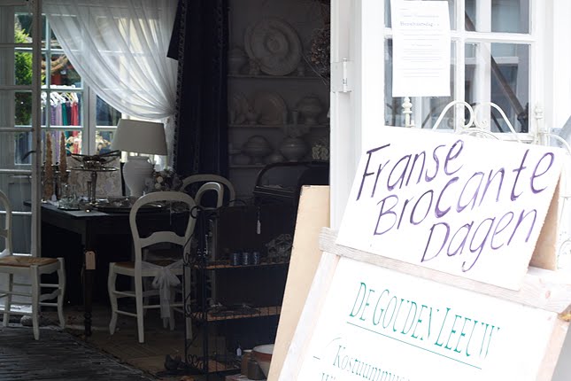 Met een halfvolle kofferbak besloten we weer te vertrekken , tot we een bord tegenkwamen Brocante met een pijl die kant............ En wat een verrassing een leuke schuur vol met Brocante voor niet al te dure prijzen. Manlief zag een trap staan en besloot dat die mee moest , ook werd er een tafel en een kist gekocht, en ik kocht nog een grote dekschaal . Tja en dan moet je naar huis er werd gepast en gemeten met de spullen , de trap was het grootste probleem nadat die een paar keer over de hoofden van de passagiers op de achterbank was gezoefd kreeg hij een plekje dwars door de auto waardoor zwager op de voorbank scheef met zijn hoofd tegen het raam zat en zo de bestuurder aanwijzingen moest geven omdat die niks meer zag in de zijspiegel. Zo hobbelden we in warme auto weer naar huis waar we lekker hebben uitgepuft in de tuin met een lekkere maaltijd , schoenen uit en met blote voeten in het gras hebben we lekker gegeten en genoten van het mooie weer. Vandaag nog een vrije dag het zonnetje schijnt alweer dus dat word weer genieten!